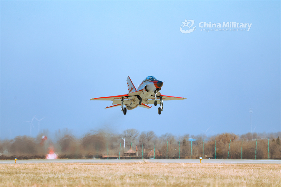 A jet trainer attached to a regiment of the PLA Naval Aviation University takes off for a flight training exercise in early January, 2024. (eng.chinamil.com.cn/Photo by Lan Pengfei, Lu Xinqian and Xu Kangyu)