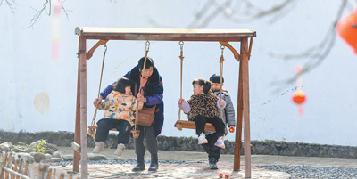Tourists play on a swing at a courtyard in Ningyuan county, Yongzhou city, central China's Hunan Province. (Photo/Jiang Keqing)