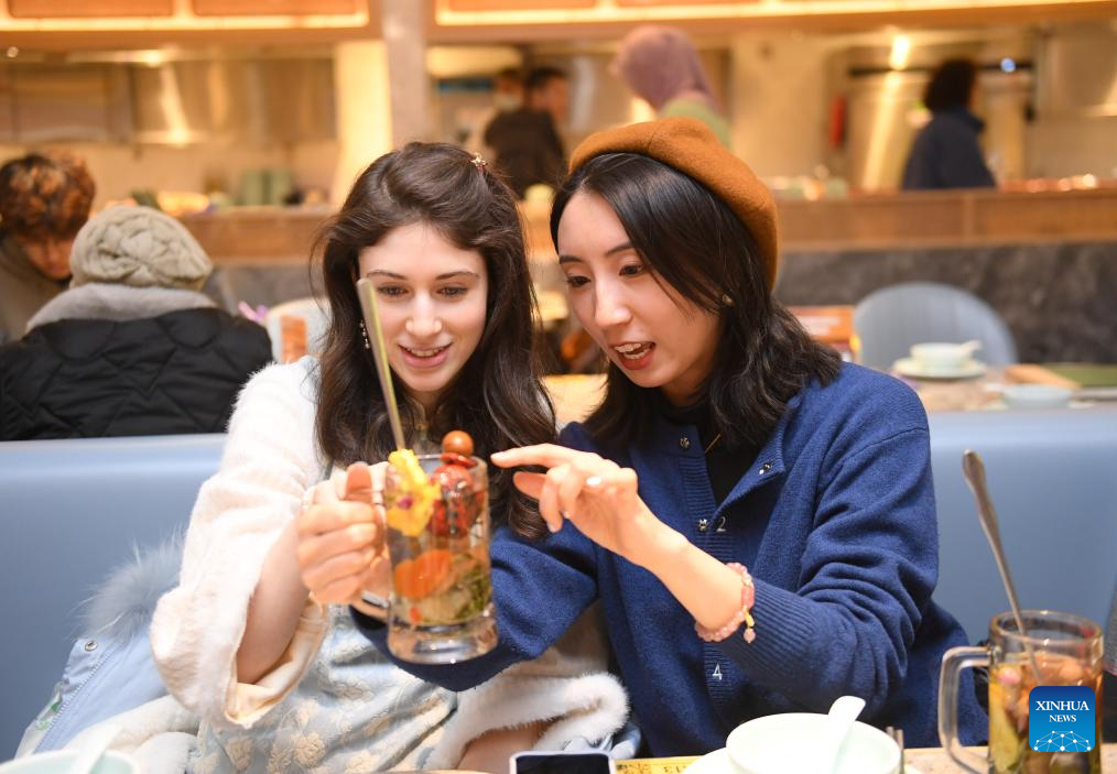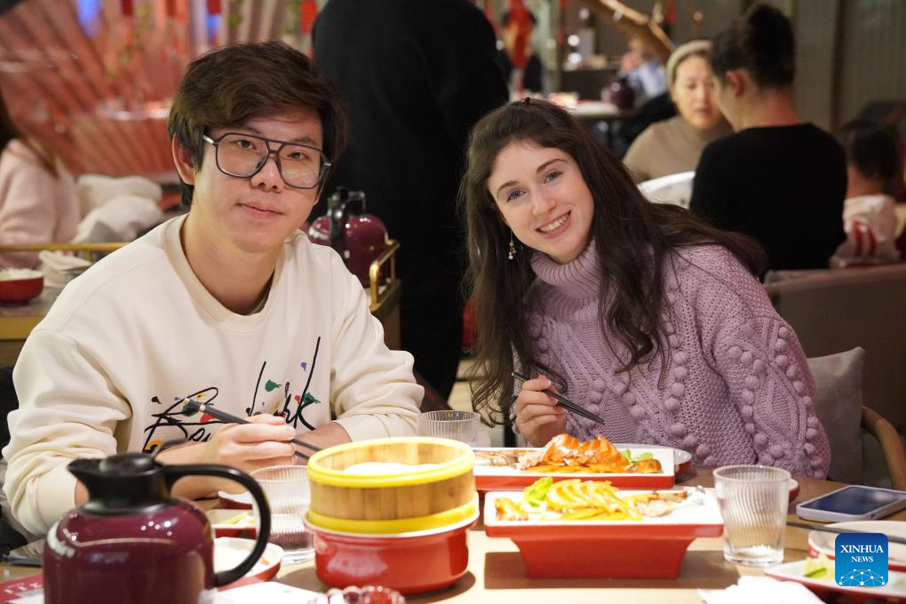 Carly Beth tastes Beijing Roast Duck with producer Wang Ruixing in Beijing, capital of China, Jan. 17, 2024. (Photo by Debbie Lynn/Xinhua)