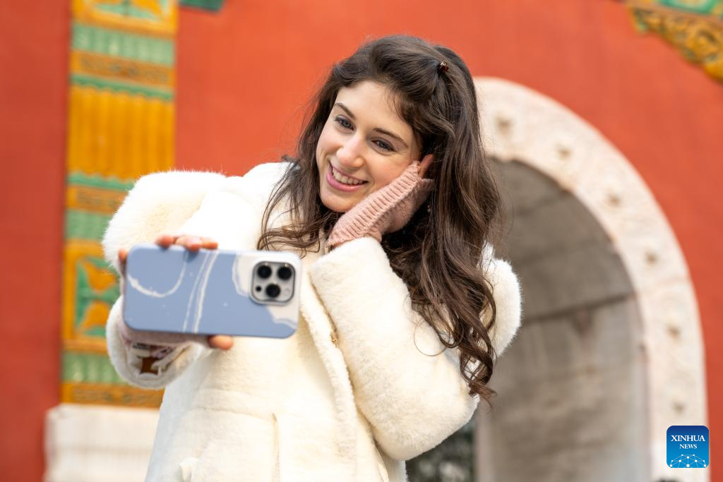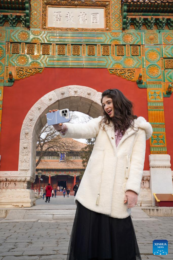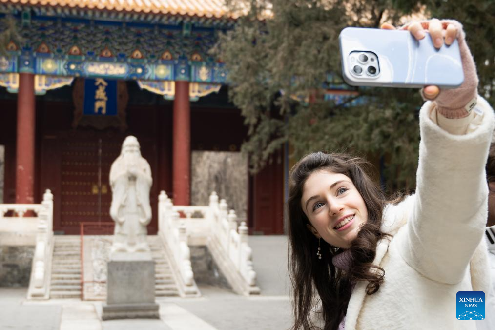 Carly Beth takes selfies at the Confucian Temple in Beijing, capital of China, Jan. 17, 2024. (Xinhua/Hu Zhixuan)