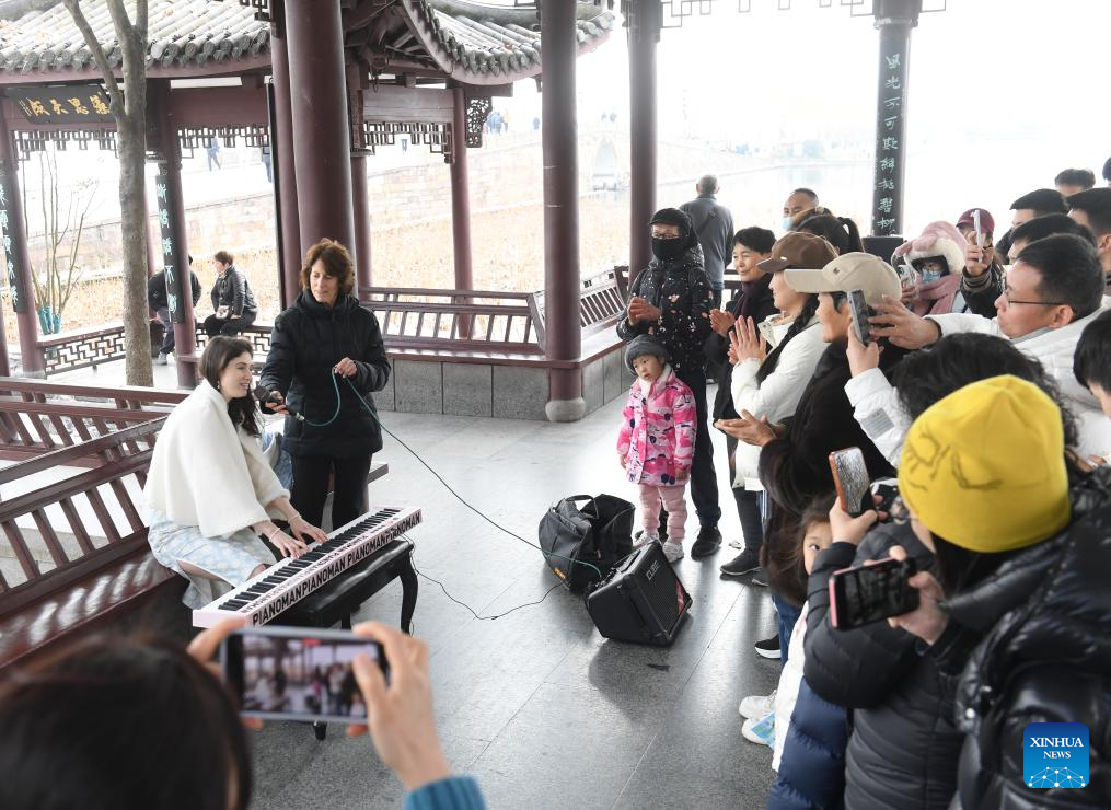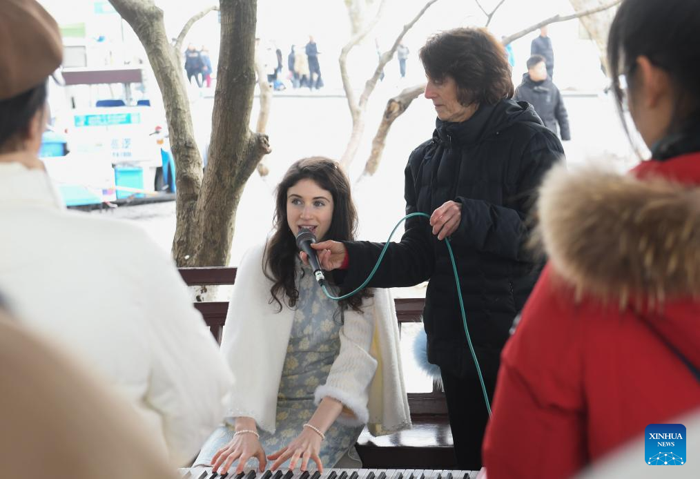 Carly Beth(C) performs on an electric piano, a gift from her Chinese fans, and sings her own songs at a pavilion near the Duanqiao Bridge, or the Broken Bridge, at the West Lake in Hangzhou, east China's Zhejiang Province, Jan. 15, 2024. (Xinhua/Weng Xinyang)