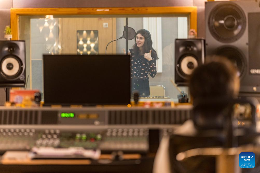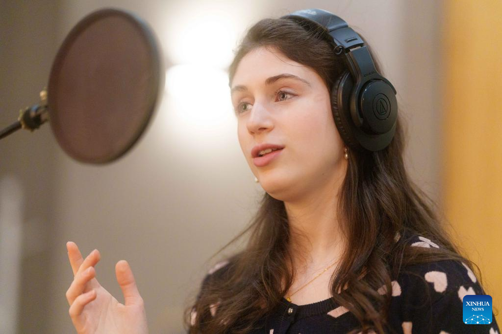 Carly Beth records a Chinese song at a studio in Beijing, capital of China, Jan. 16, 2024. (Xinhua/Zhou Dixiao)