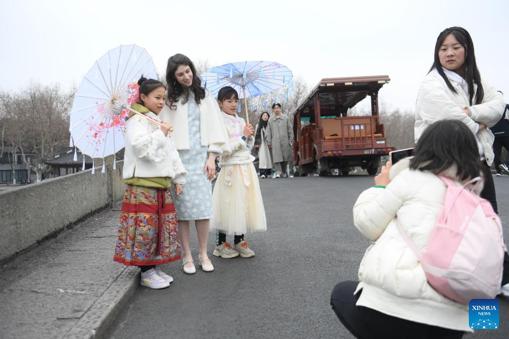 Carly Beth (2nd, L) poses for photos with tourists in traditional Chinese costumes at Duanqiao Bridge, or the Broken Bridge, at the West Lake in Hangzhou, east China's Zhejiang Province, Jan. 15, 2024. (Xinhua/Weng Xinyang)