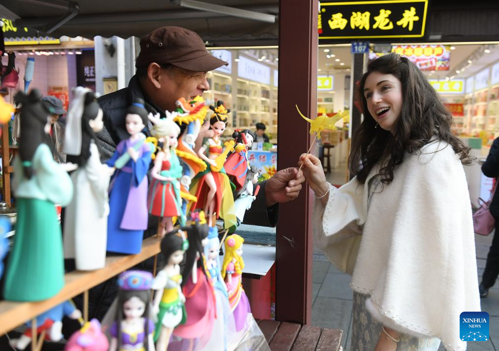 Carly Beth (R) buys a sugar figurine in Hangzhou, east China's Zhejiang Province, Jan. 15, 2024. (Xinhua/Weng Xinyang)