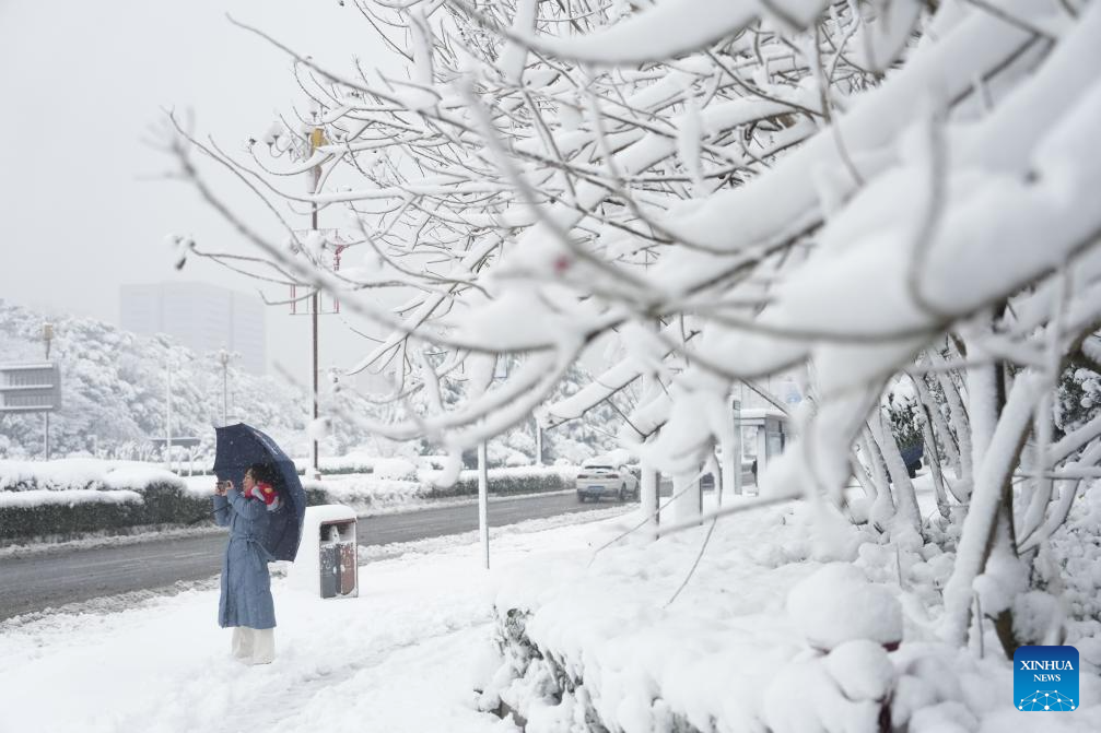 A woman takes photos of the snow scenery in Changsha, central China's Hunan Province, Jan. 22, 2024. Changsha saw its first snowfall of 2024 from Sunday night to Monday morning. (Xinhua/Xue Yuge)