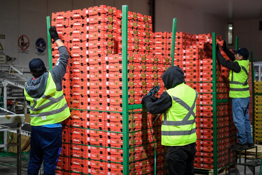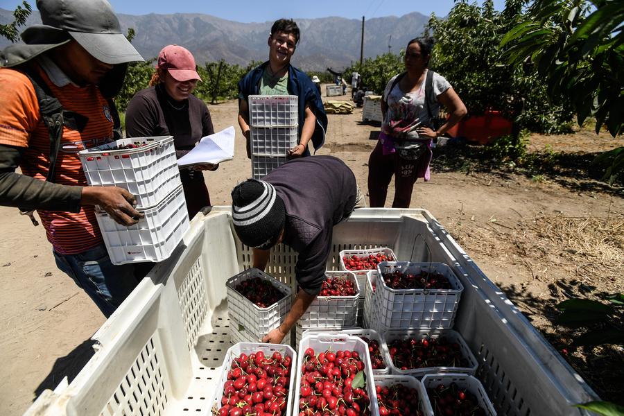 Workers transport newly harvested cherries at a plantation near Santiago, Chile, Dec. 5, 2019. (Photo by Jorge Villegas/Xinhua)