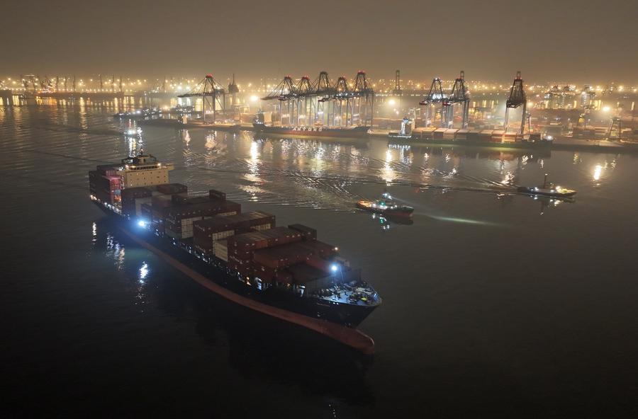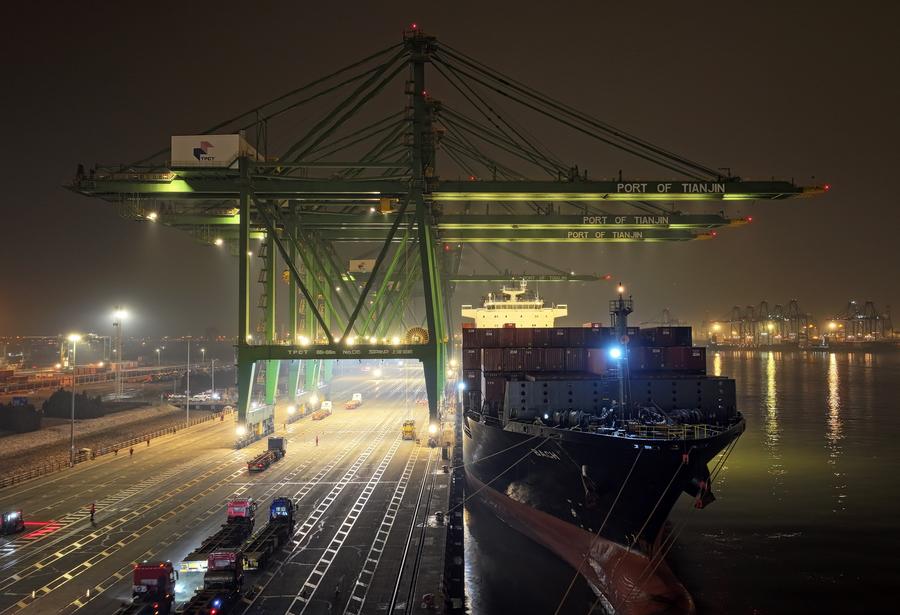 Staff members tie up a container vessel loaded with imported cherries at a container terminal of Tianjin Port in north China's Tianjin, Jan. 16, 2024. (Xinhua/Zhao Zishuo)