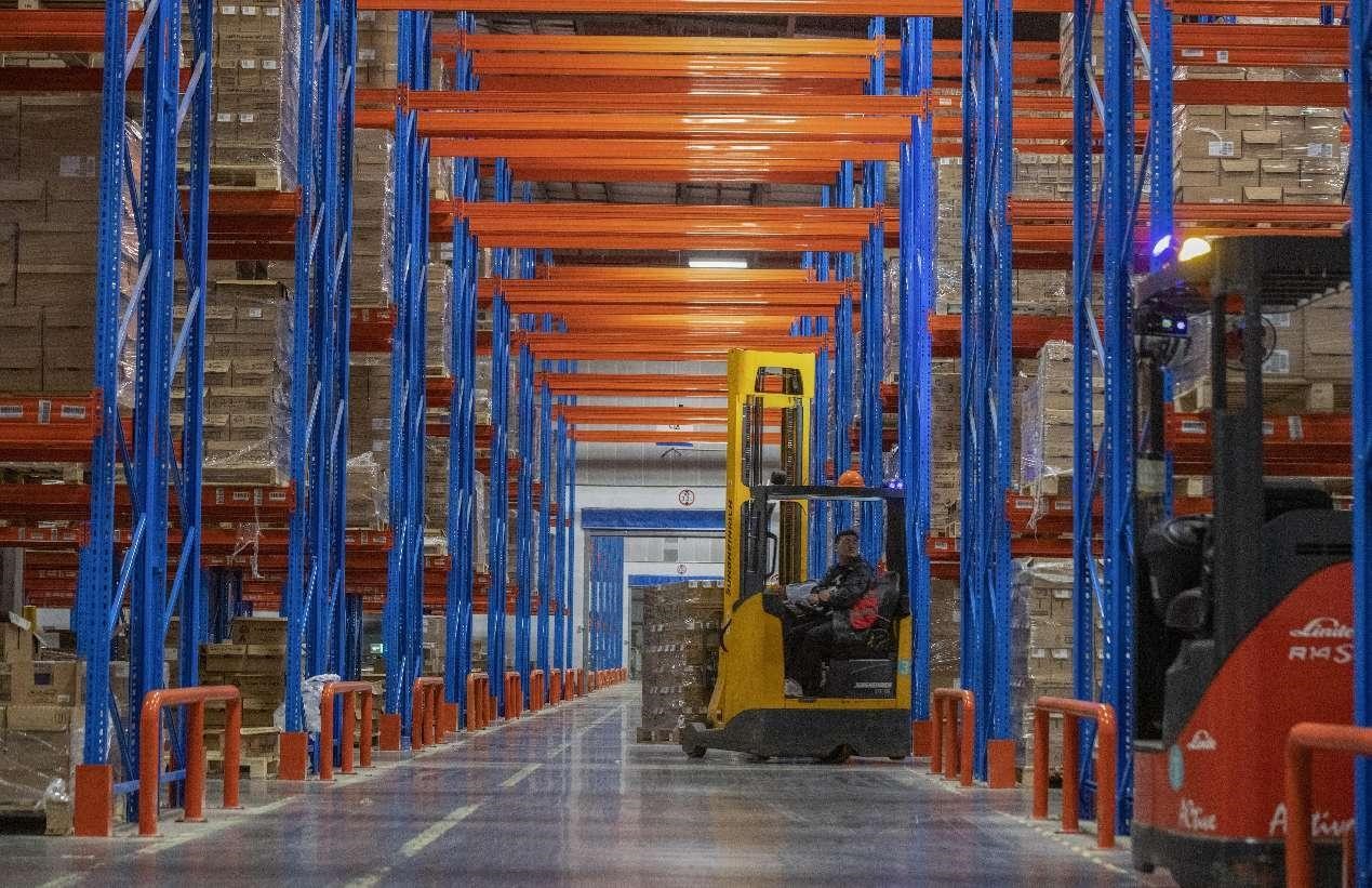 A man drives a forklift in a warehouse at Jinyi Comprehensive Bonded Zone in Jinhua, east China's Zhejiang province. (People's Daily Online/Shi Kuanbing)