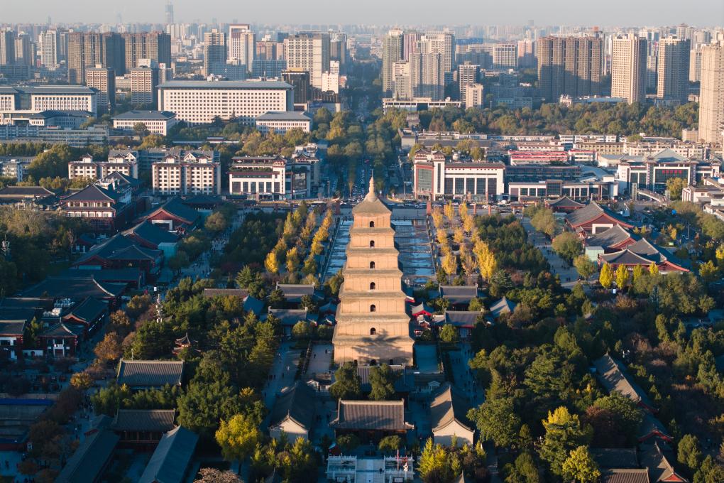 An aerial drone photo taken on Nov. 17, 2023 shows Dayan Pagoda in Xi'an, capital of northwest China's Shaanxi Province. (Xinhua/Shao Rui)