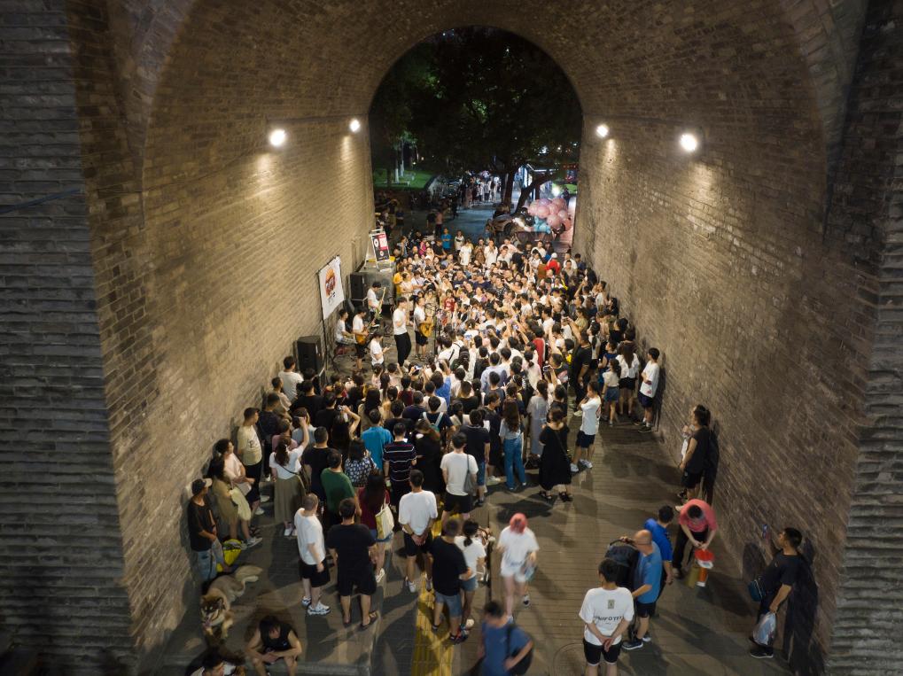 An aerial drone photo taken on Aug. 10, 2023 shows people watching a performance by a band in Xi'an, northwest China's Shaanxi Province. (Xinhua/Shao Rui)