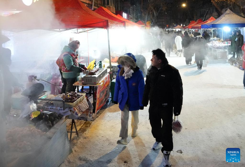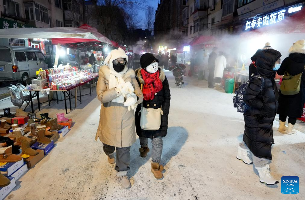 Tourists visit the Hongzhuan Morning Market in Harbin, northeast China's Heilongjiang Province, Jan. 22, 2024. (Xinhua/Wang Yuguo)
