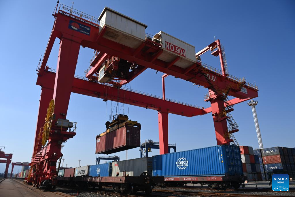 Cranes and sea-rail intermodal trains work at the Beilun port railway station of the Ningbo-Zhoushan Port in east China's Zhejiang Province, Jan. 24, 2024. (Xinhua/Huang Zongzhi)
