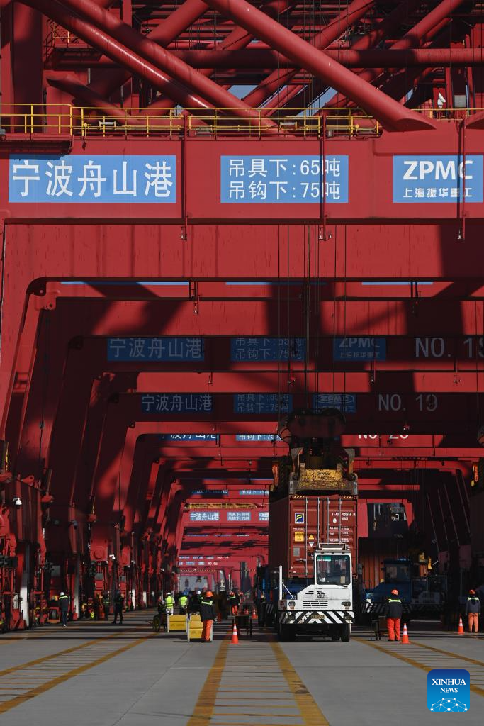 Cranes and trucks work at a container terminal at the Meishan port area of the Ningbo-Zhoushan Port in east China's Zhejiang Province, Jan. 24, 2024. (Xinhua/Huang Zongzhi)