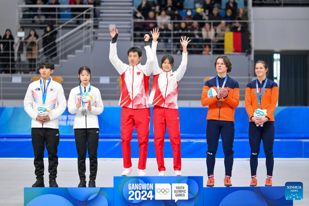 Pan Baoshuo (L) and Liu Yunqi of team China pose during the victory ceremony after the mixed relay final of speed skating event at the Gangwon 2024 Winter Youth Olympic Games in Gangneung, South Korea, Jan. 25, 2024. (Xinhua/Zhu Wei)