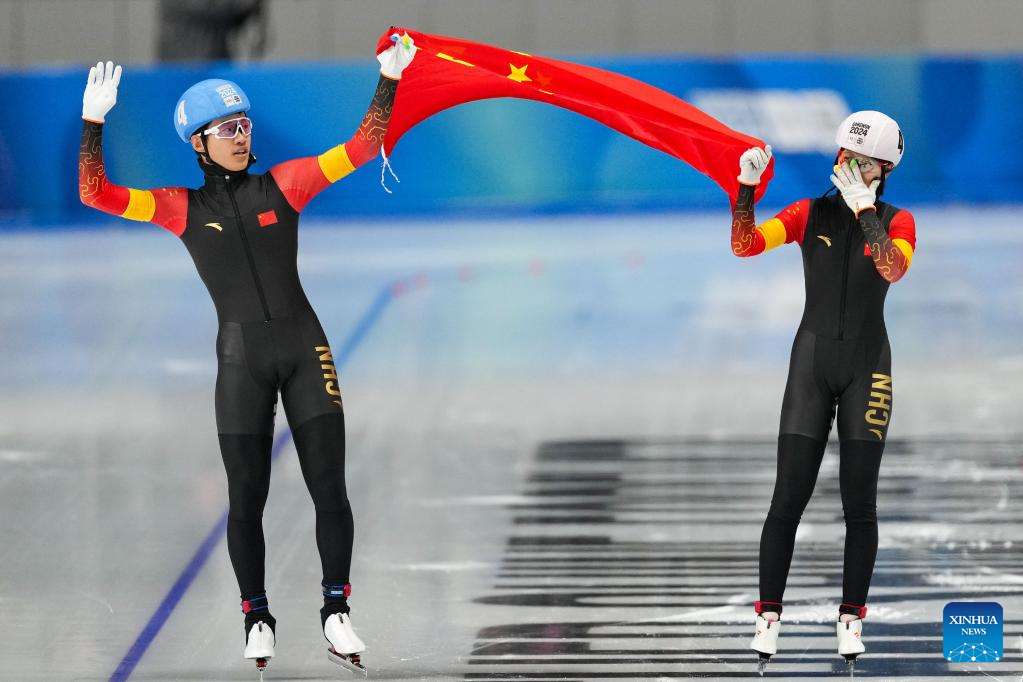 Pan Baoshuo (L) and Liu Yunqi of team China celebrate after winning the mixed relay final of speed skating event at the Gangwon 2024 Winter Youth Olympic Games in Gangneung, South Korea, Jan. 25, 2024. (Xinhua/Zhang Xiaoyu)