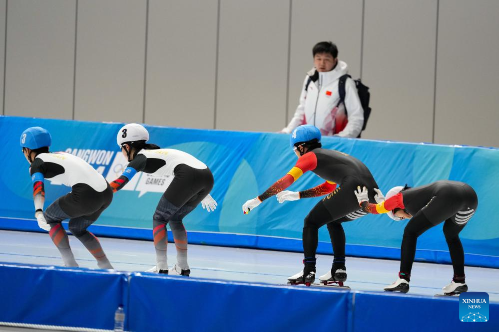 Liu Yunqi (2nd L) of team China competes during the mixed relay final of speed skating event at the Gangwon 2024 Winter Youth Olympic Games in Gangneung, South Korea, Jan. 25, 2024. (Xinhua/Zhu Wei)