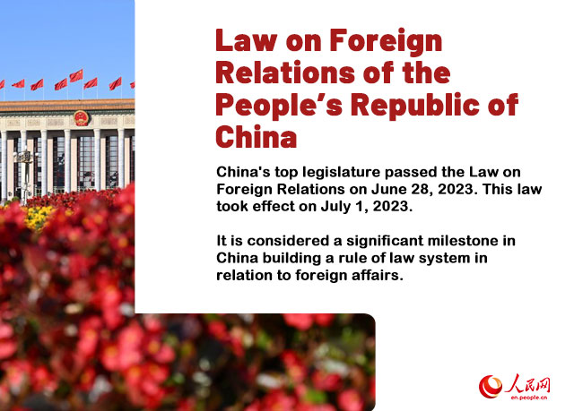 China's top legislature passed the Law on Foreign Relations on June 28, 2023. This law took effect on July 1, 2023.