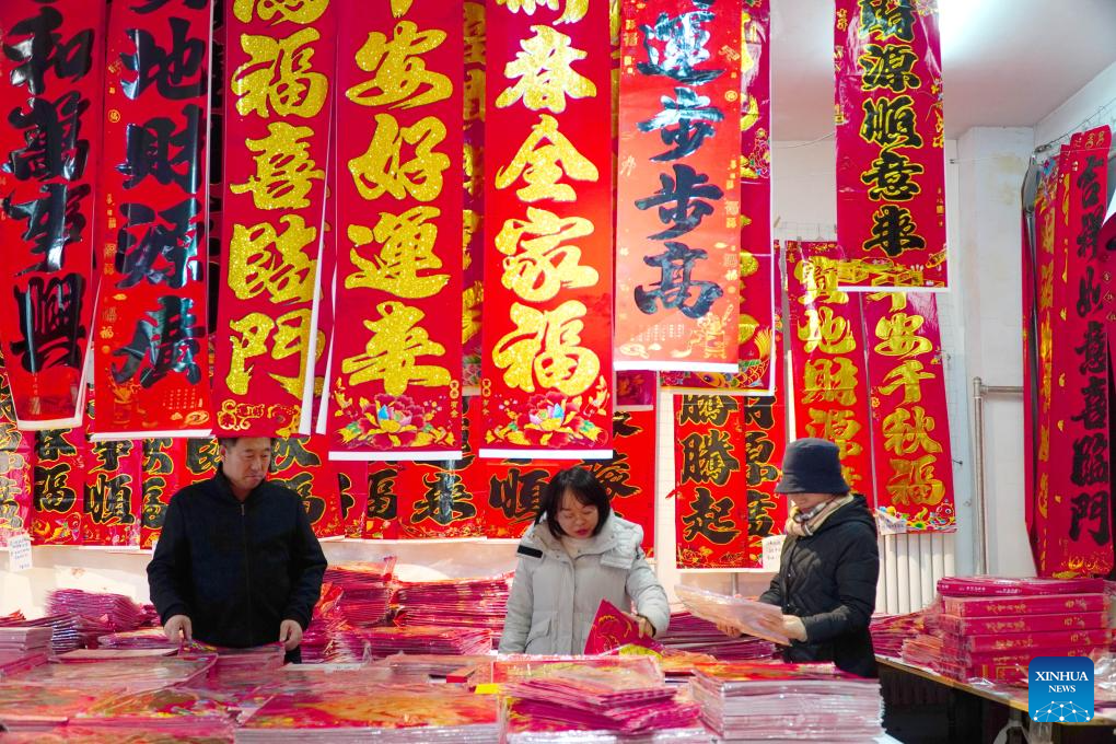 Dealers purchase Spring Festival couplets and posters in Donglijia Village of Gaomi City, east China's Shandong Province, on Jan. 23, 2024. As the Spring Festival is approaching, workers have been busy producing Spring Festival couplets and posters with good blessings for the upcoming lunar new year in Gaomi, a major producing base in Shandong Province. The Spring Festival couplets and posters producing industry here yields almost 8000 tonnes annually with an output value of nearly 100 million yuan (13.9 million U.S. dollars). It has become a characteristic industry increasing villagers' income. (Xinhua/Xu Suhui)