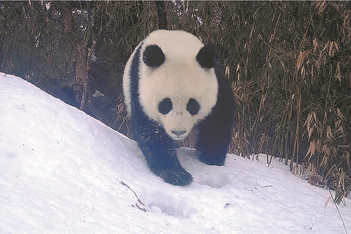 A wild giant panda is seen in Sichuan Province in February. [Photo/Xinhua]