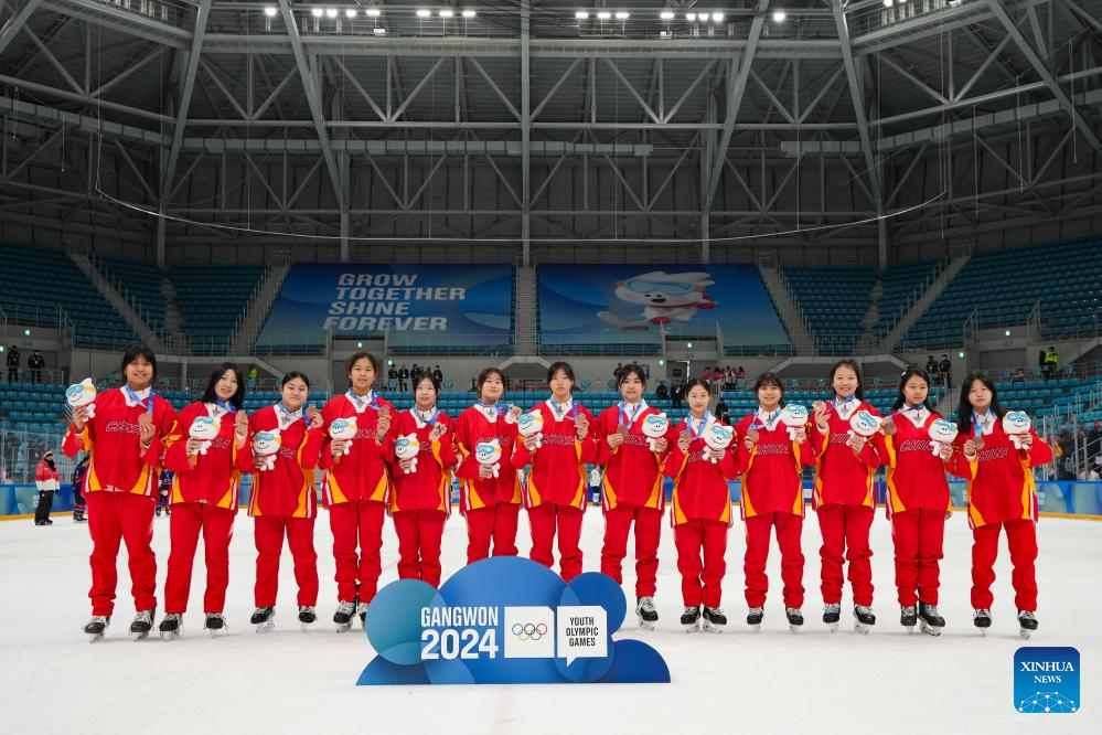 Team China pose for photos during the victory ceremony for the Women's 3-on-3 Tournament of ice hockey event at the Gangwon 2024 Winter Youth Olympic Games in Gangneung, South Korea, Jan. 25, 2024. (Xinhua/Zhang Xiaoyu)