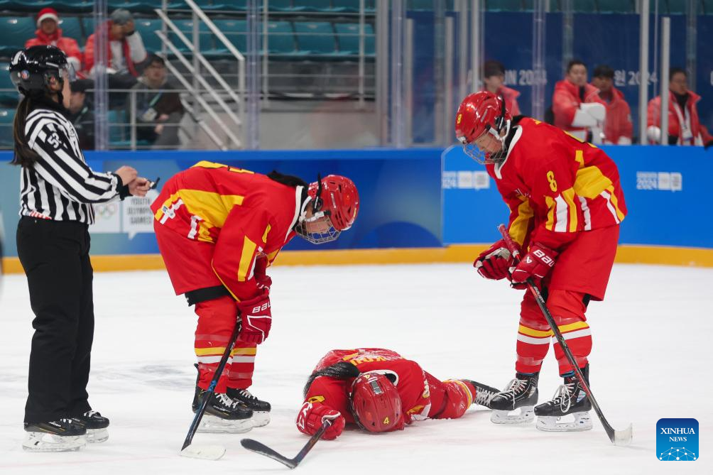 Kou Chenfei (Bottom) of China falls down during the Women's 3-on-3 Tournament Bronze Medal Game of ice hockey event between China and Italy at the Gangwon 2024 Winter Youth Olympic Games in Gangneung, South Korea, Jan. 25, 2024. (Xinhua/Xu Yanan)