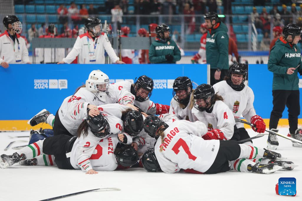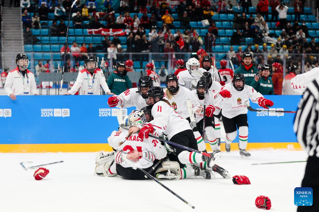 Players of Hungary celebrates after winning the Women's 3-on-3 Tournament Gold Medal Game of ice hockey event between Hungary and South Korea at the Gangwon 2024 Winter Youth Olympic Games in Gangneung, South Korea, Jan. 25, 2024. (Xinhua/Xu Yanan)