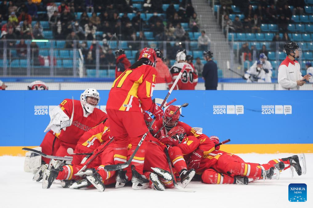 Team China celebrate after winning the Women's 3-on-3 Tournament Bronze Medal Match of ice hockey event between China and Italy at the Gangwon 2024 Winter Youth Olympic Games in Gangneung, South Korea, Jan. 25, 2024. (Xinhua/Xu Yanan)