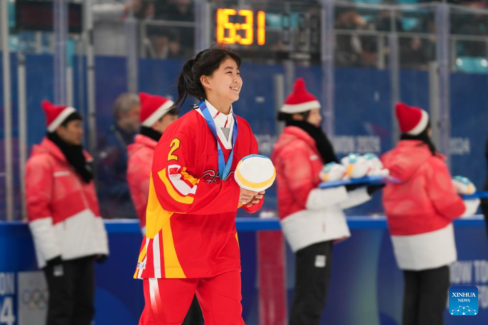 Li Jinnuo of China attends the victory ceremony for the Women's 3-on-3 Tournament of ice hockey event at the Gangwon 2024 Winter Youth Olympic Games in Gangneung, South Korea, Jan. 25, 2024. (Xinhua/Zhang Xiaoyu)