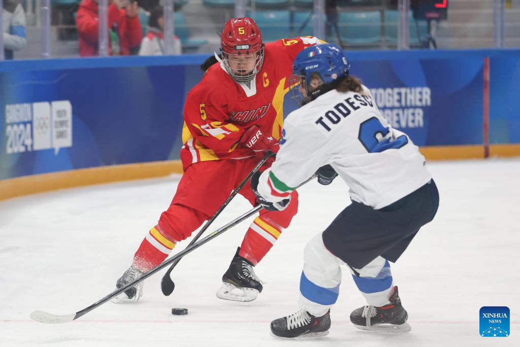 Zhang Anna (R) of China scores during the Women's 3-on-3 Tournament Bronze Medal Match of ice hockey event between China and Italy at the Gangwon 2024 Winter Youth Olympic Games in Gangneung, South Korea, Jan. 25, 2024. (Xinhua/Xu Yanan)