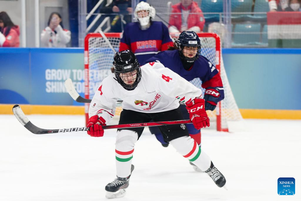 Petra Polonyi (Front) of Hungary competes during the Women's 3-on-3 Tournament Gold Medal Game of ice hockey event between Hungary and South Korea at the Gangwon 2024 Winter Youth Olympic Games in Gangneung, South Korea, Jan. 25, 2024. (Xinhua/Xu Yanan)