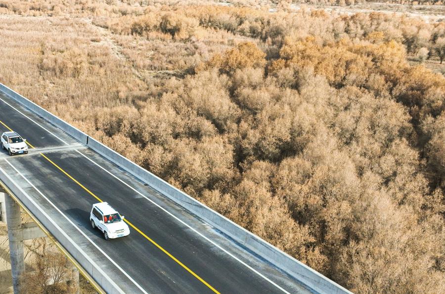 An aerial drone photo taken on Dec. 1, 2023 shows vehicles running on a bridge through a desert poplar (populus euphratica) forest in Tumxuk City, northwest China's Xinjiang Uygur Autonomous Region. (Photo by Zhao Chengwei/Xinhua)