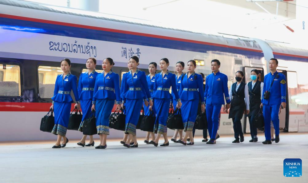 Crew members of the Lane Xang electric multiple unit (EMU) trains are seen at Vientiane Station of the China-Laos Railway in Vientiane, Laos, Jan. 26, 2024. The China-Laos Railway is witnessing its first Spring Festival travel rush since the railway started cross-border passenger services on April 13, 2023. (Photo by Yang Yongquan/Xinhua)