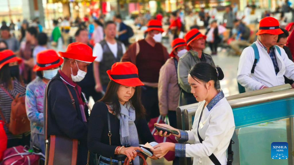 Passengers have their tickets checked at Vientiane Station of the China-Laos Railway in Vientiane, Laos, Jan. 26, 2024. The China-Laos Railway is witnessing its first Spring Festival travel rush since the railway started cross-border passenger services on April 13, 2023. (Photo by Yang Yongquan/Xinhua)