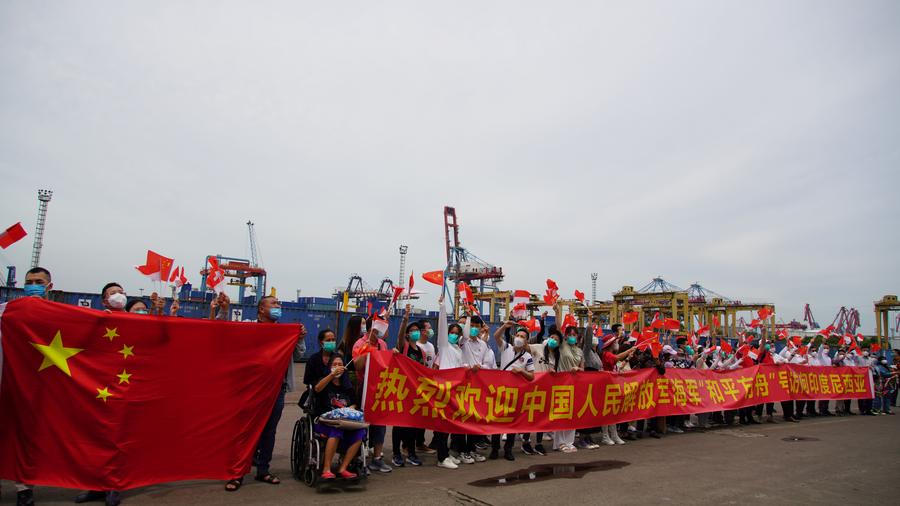 People welcome Chinese naval hospital ship Peace Ark in Indonesia's capital Jakarta, Nov. 10, 2022. Peace Ark is China's first hospital ship that has a capacity of over 10,000 tonnes. The ship arrived in Indonesia's capital Jakarta on Nov. 10 and has since provided free medical checkups for members of the public. (Photo by Peng Bingjie/Xinhua)