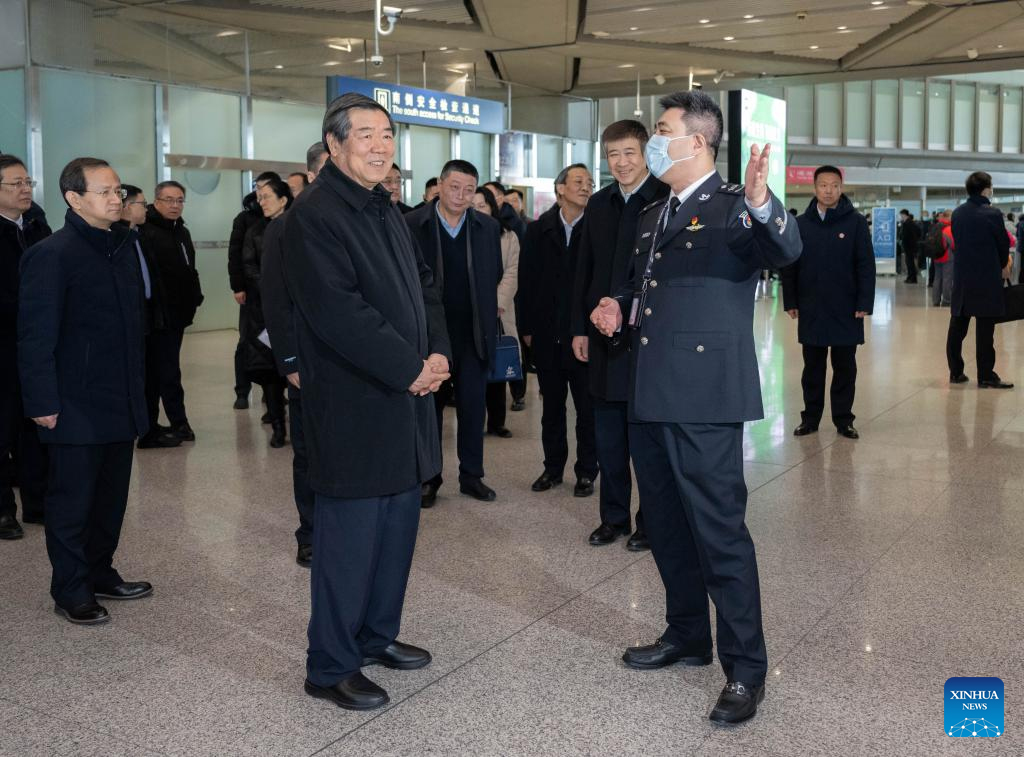 Chinese Vice Premier He Lifeng, also a member of the Political Bureau of the Communist Party of China Central Committee, visits a terminal building of Beijing Capital International Airport while examining preparations for the Spring Festival travel rush in Beijing, capital of China, Jan. 26, 2024. (Xinhua/Zhai Jianlan)