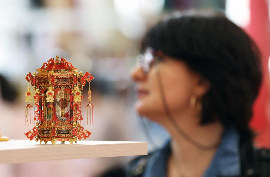 A woman visits an exhibition on the Chinese culture at the Porte de Versailles exhibition center in Paris, France, May 2, 2023. (Xinhua/Gao Jing)