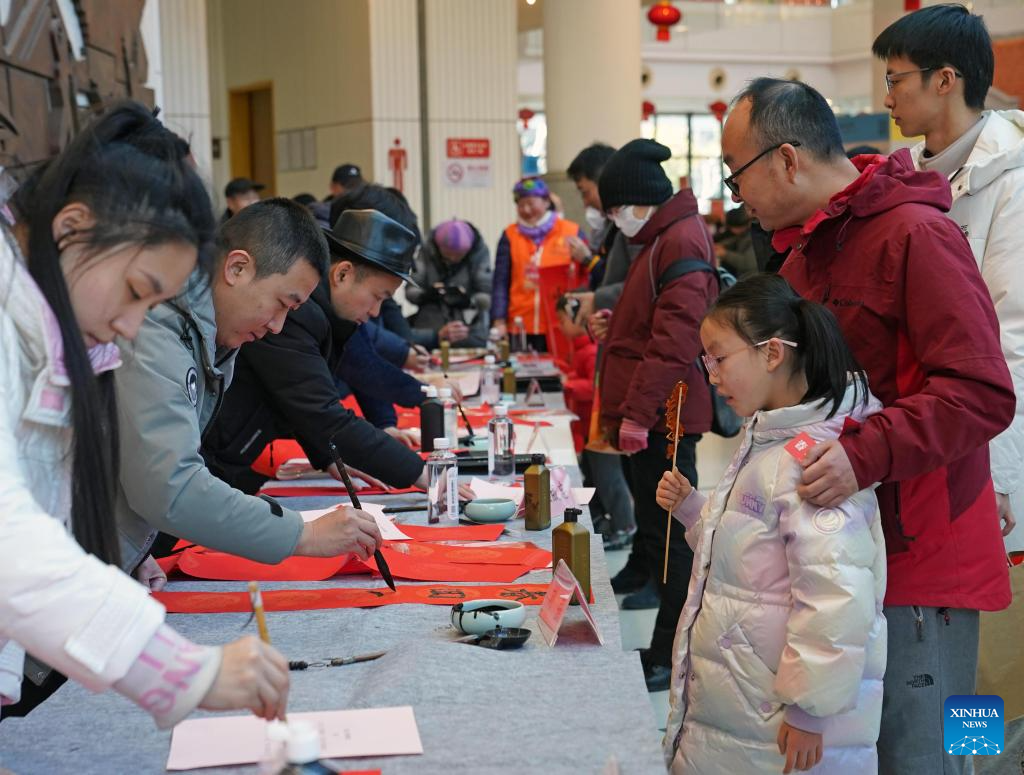 Calligraphers write Spring Festival couplets for visitors during an exhibition of Chinese New Year customs at Shanghai Mass Art Center in Shanghai, east China, Jan. 28, 2024. Hundreds of exhibits including photos and unique products of Shanghai have been displayed at the exhibition to show Chinese New Year customs in Shanghai. (Xinhua/Liu Ying)