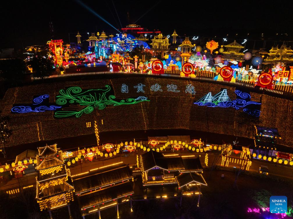 A drone photo taken on Jan. 26, 2024 shows light installations for an upcoming lantern show in Zigong, southwest China's Sichuan Province. The city of Zigong is well known for the large number of dinosaur fossils that have been unearthed in past decades. (Xinhua/Shen Bohan)