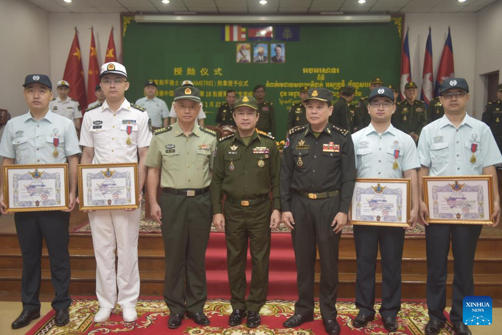 Lt. Gen. Moeung Ponlork, director general of the General Department of Logistics and Finance at the Cambodian Ministry of National Defense, presented the "Knight Class" medals to them at a ceremony held here.