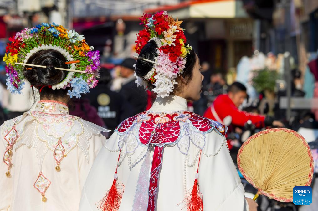 A villager pins a flowery headwear for a tourist at Xunpu Village of Quanzhou City, southeast China's Fujian Province, Jan. 26, 2024. Xunpu flowery headwear, dubbed "overhead gardens," have been a signature of "Xunpu Women Customs" listed as a national intangible heritage in 2008. They attracted millions of eyes in the cyber world in early 2023, followed by a sustainable tourist boom in the village, where visitors are able to literally fit their heads in them. Photo-shooting, dining and other hospitality services have diversified the source of income for residents of this small costal village that used to rely on fishing and mudflat aquaculture. (Xinhua/Wei Peiquan)