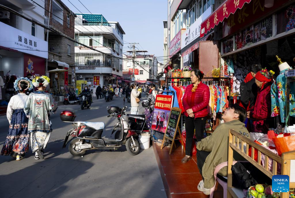 A photo studio featuring local traditional costumes is seen at Xunpu Village of Quanzhou City, southeast China's Fujian Province, Jan. 26, 2024. Xunpu flowery headwear, dubbed "overhead gardens," have been a signature of "Xunpu Women Customs" listed as a national intangible heritage in 2008. They attracted millions of eyes in the cyber world in early 2023, followed by a sustainable tourist boom in the village, where visitors are able to literally fit their heads in them. Photo-shooting, dining and other hospitality services have diversified the source of income for residents of this small costal village that used to rely on fishing and mudflat aquaculture. (Xinhua/Wei Peiquan)