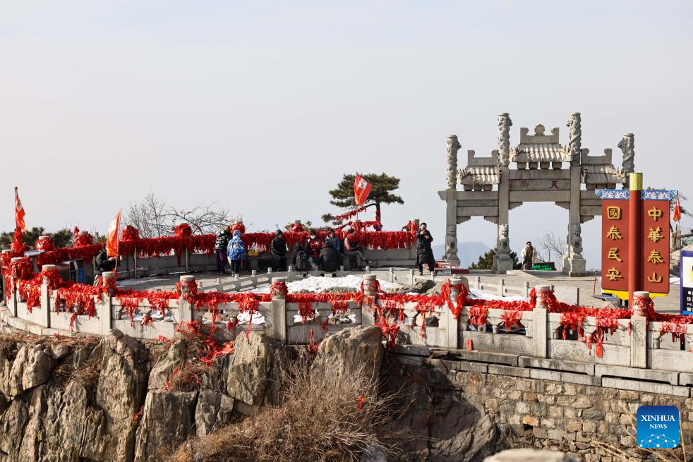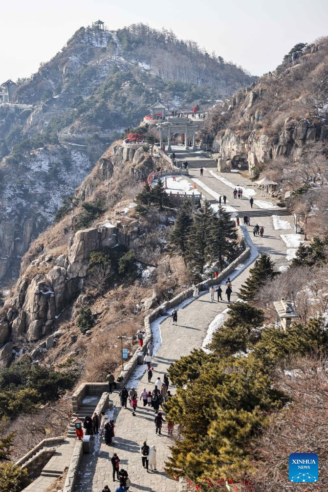 Tourists visit the Mount Tai scenic area in east China's Shandong Province, Jan. 26, 2024. With its natural and cultural values well interconnected, Mount Tai was listed as a World Cultural and Natural Heritage site by UNESCO in 1987, the first ever in China. In 2023, the Mount Tai scenic area received over 8.61 million visitors, a new record over the years. (Xinhua/Zhu Zheng)
