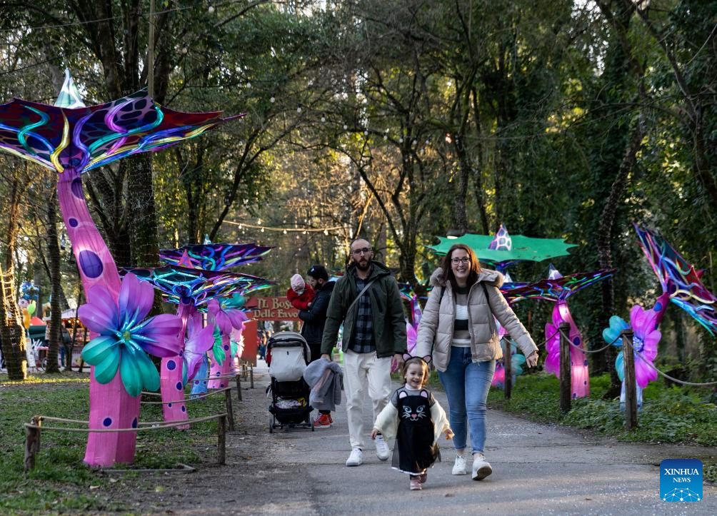 Visitors walk past lanterns during the International Lantern Festival "Lanternia" in Cassino, central Italy, Jan. 28, 2024. More than 300 Chinese lanterns made by artisans from Zigong, a southwest China's city famous for its lantern making, are exhibited here. Since its opening on Dec. 8, 2023, the lantern show has attracted approximately 80,000 visitors. (Xinhua/Li Jing)