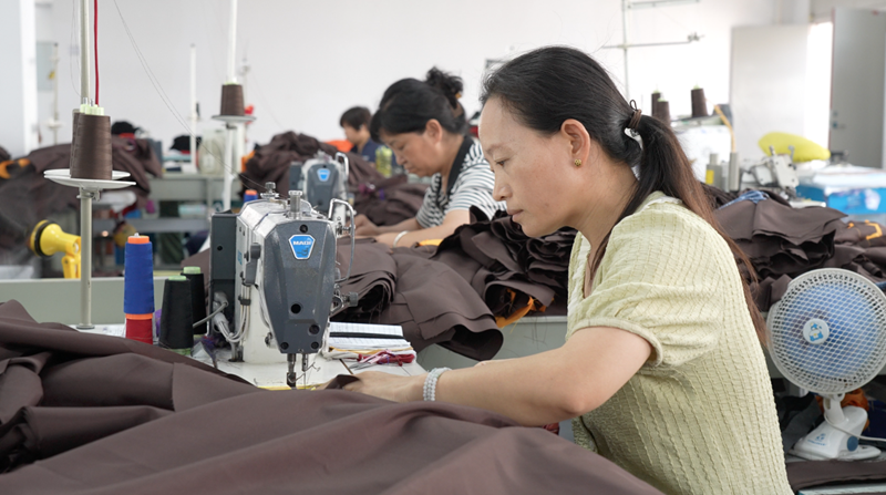 Villagers working at the collective clothing factory in Xichangshui village rush to make clothes. (Photo/Li Zhibin)