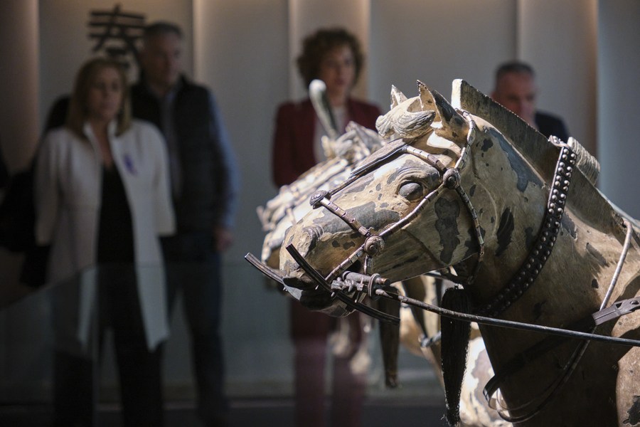 People visit an exhibition of China's renowned Terracotta Warriors in Alicante, Spain, March 28, 2023. (Xinhua/Meng Dingbo)