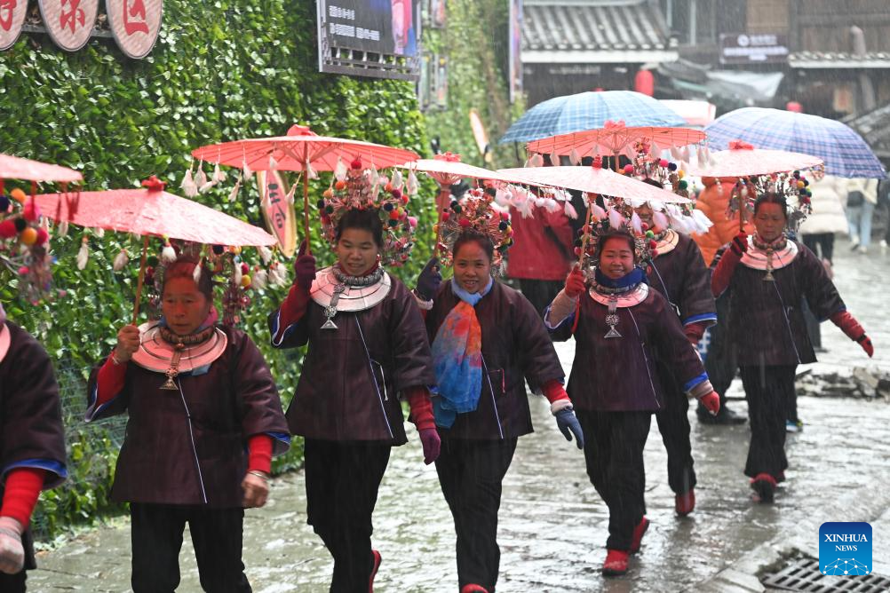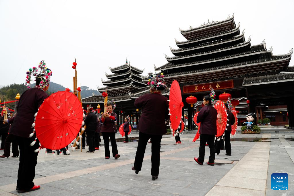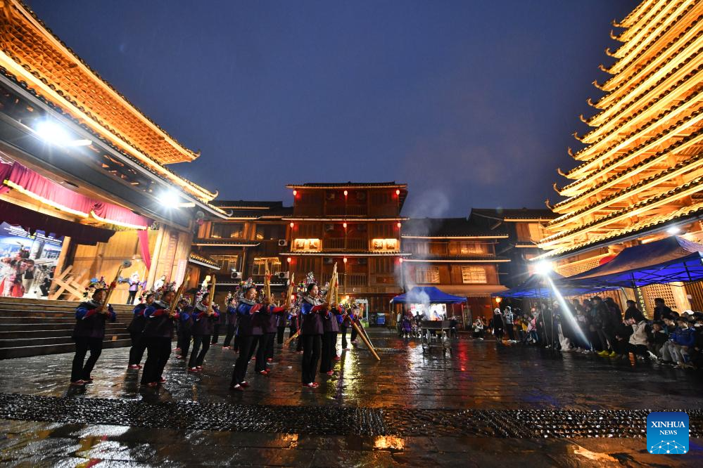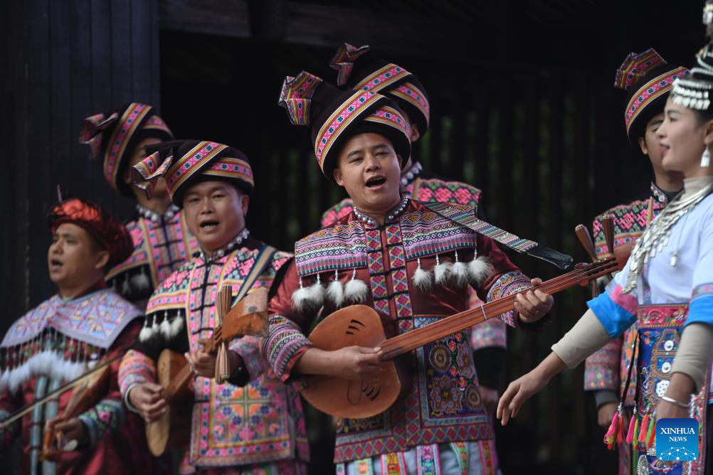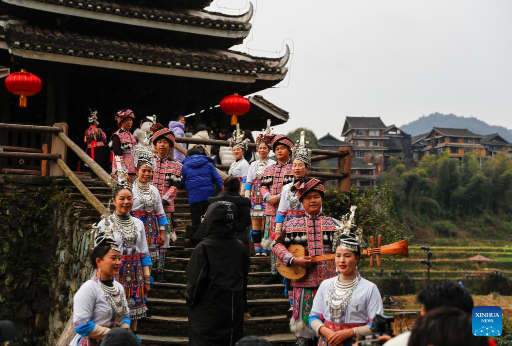 Performers sing songs of Dong ethnic group to welcome tourists in Sanjiang Dong Autonomous County, Liuzhou City of south China's Guangxi Zhuang Autonomous Region, Jan. 28, 2024. (Xinhua/Hu Xingyu)