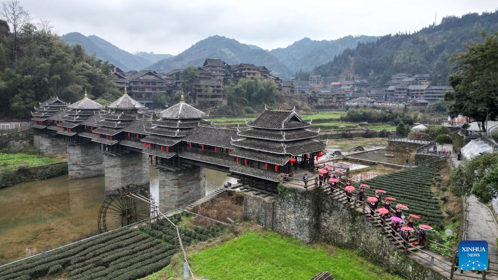 A drone photo taken on Jan. 27, 2024 shows performers singing songs of Dong ethnic group to welcome tourists in Sanjiang Dong Autonomous County, Liuzhou City of south China's Guangxi Zhuang Autonomous Region. (Xinhua/Huang Xiaobang)