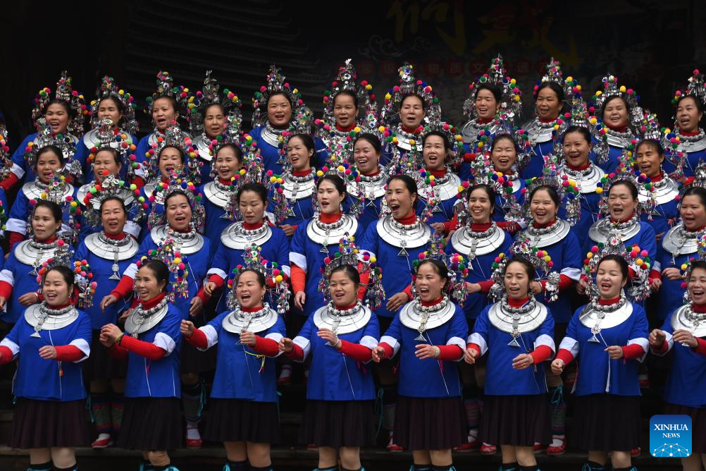 Villagers sing songs at a scenic spot in Sanjiang Dong Autonomous County, Liuzhou City of south China's Guangxi Zhuang Autonomous Region, Jan. 28, 2024. (Xinhua/Huang Xiaobang)