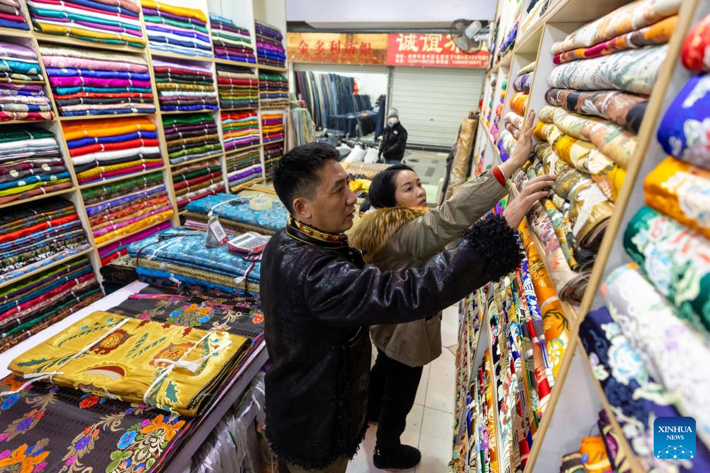Nyima Wangden (L) selects cloth for traditional Tibetan costumes at a market in Chengdu, southwest China's Sichuan Province, Jan. 5, 2024. (Xinhua/Shen Bohan)