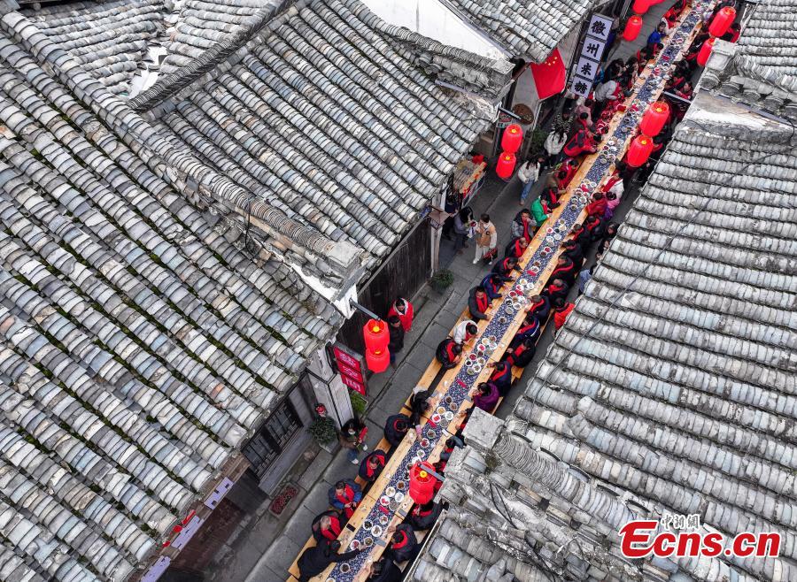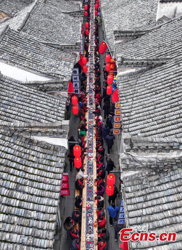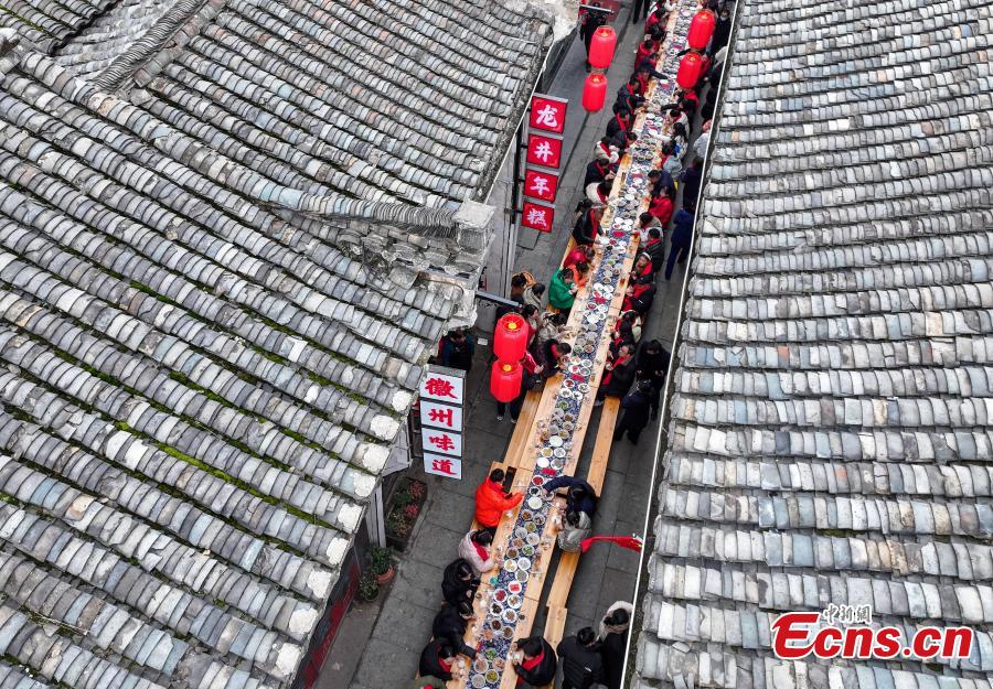 Tourists enjoy a long-table banquet along a street in Huangshan city, east China's Anhui Province, Jan. 30, 2024. (Photo: China News Service/Shi Yalei)